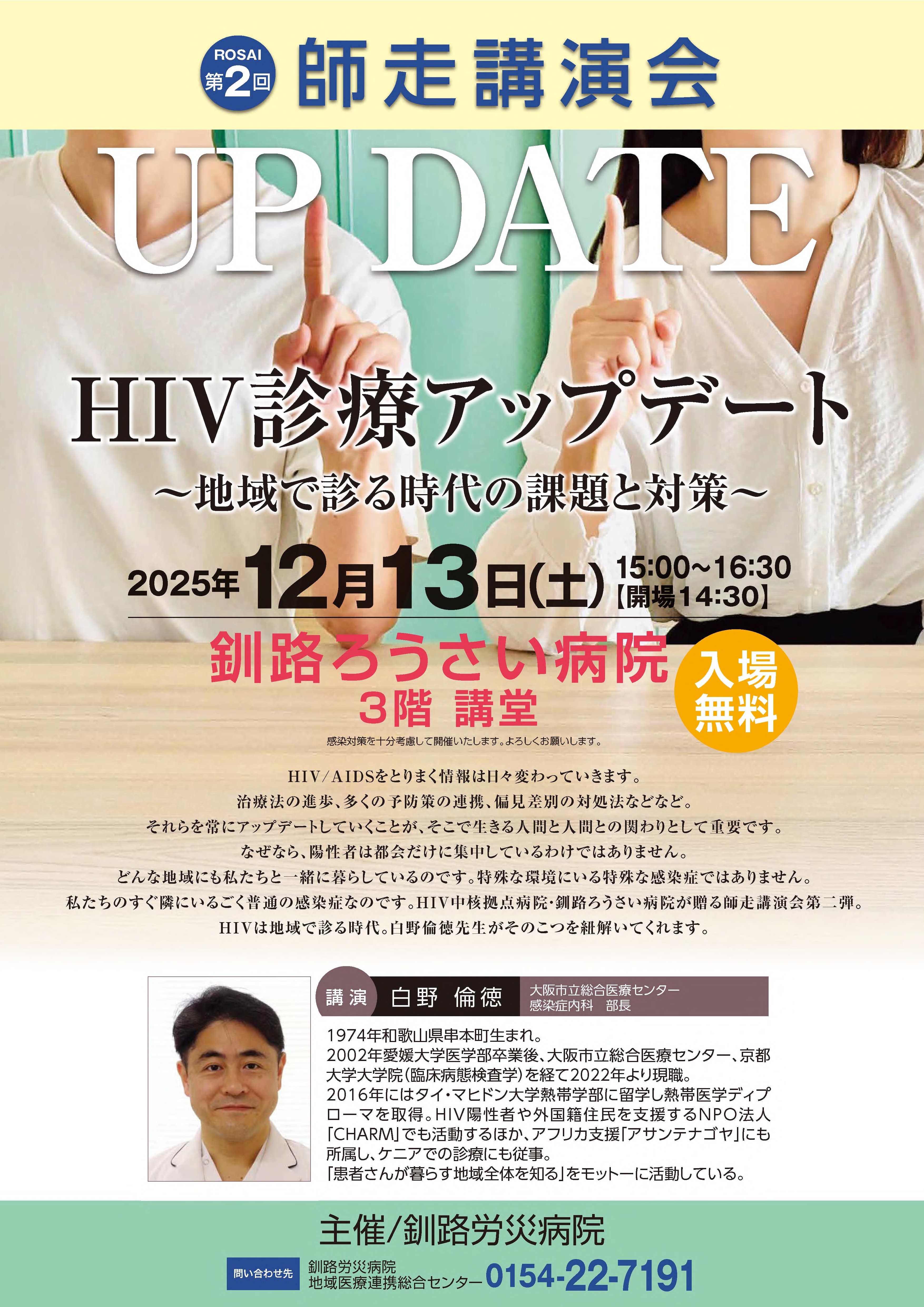 当院はエイズ中核拠点病院として、HIV医療の普及と啓発に取り組んでいます。このたび、毎年恒例の「師走講演会」を開催いたします。医療従事者の方はもちろん、一般の方もご参加いただけます。ぜひこの機会にHIV医療への理解を深めてください。